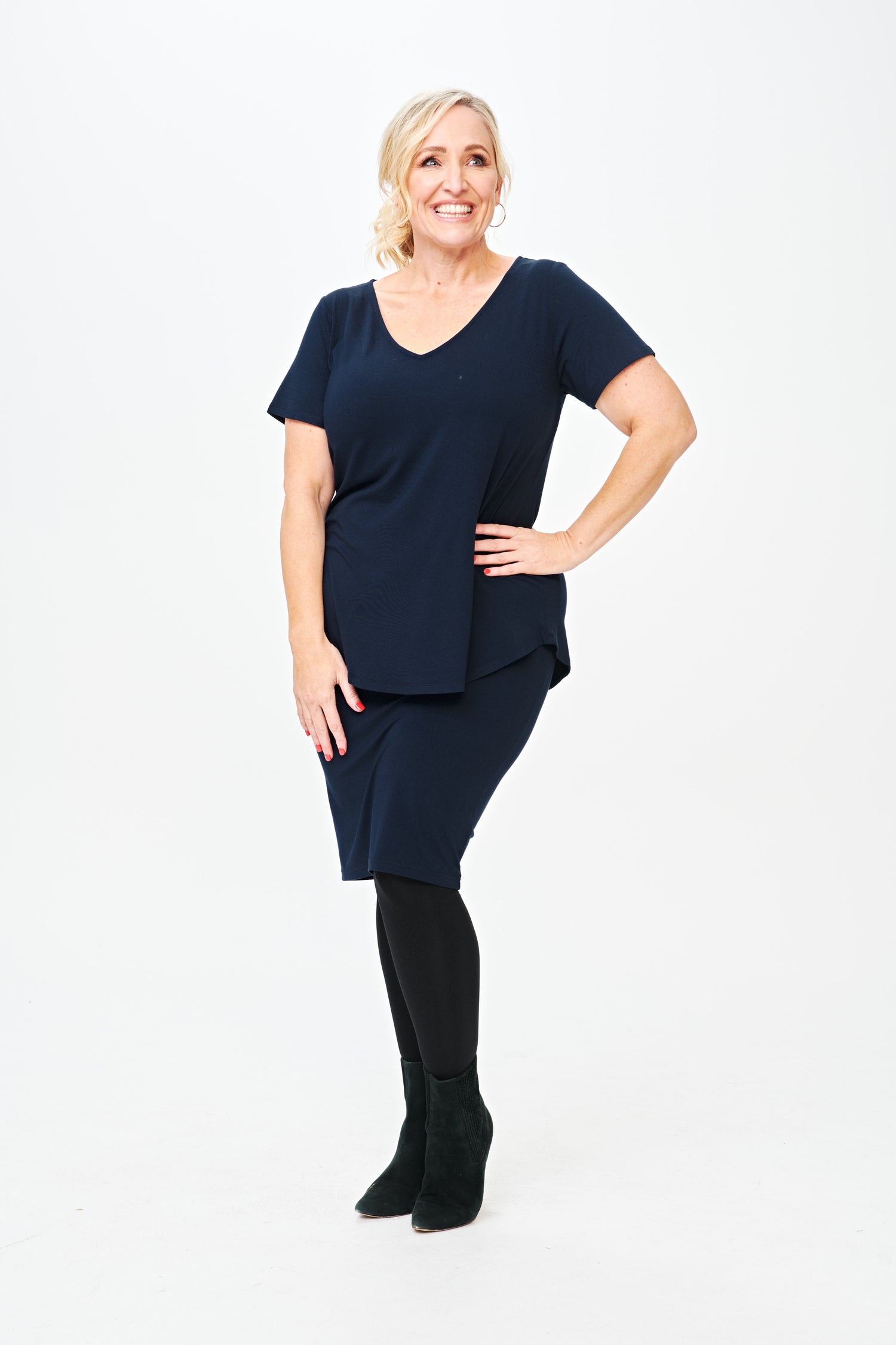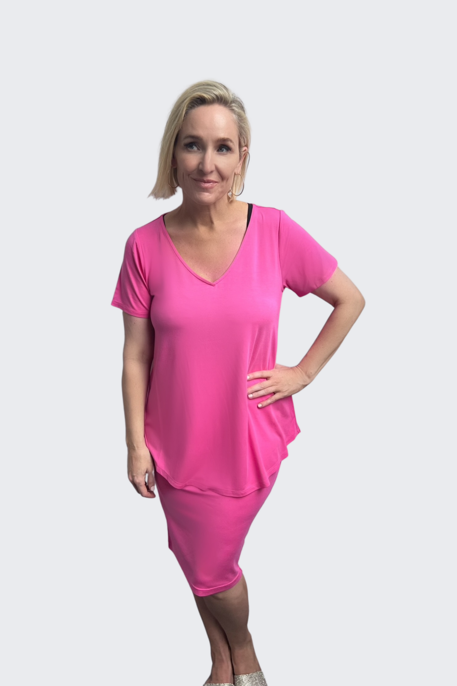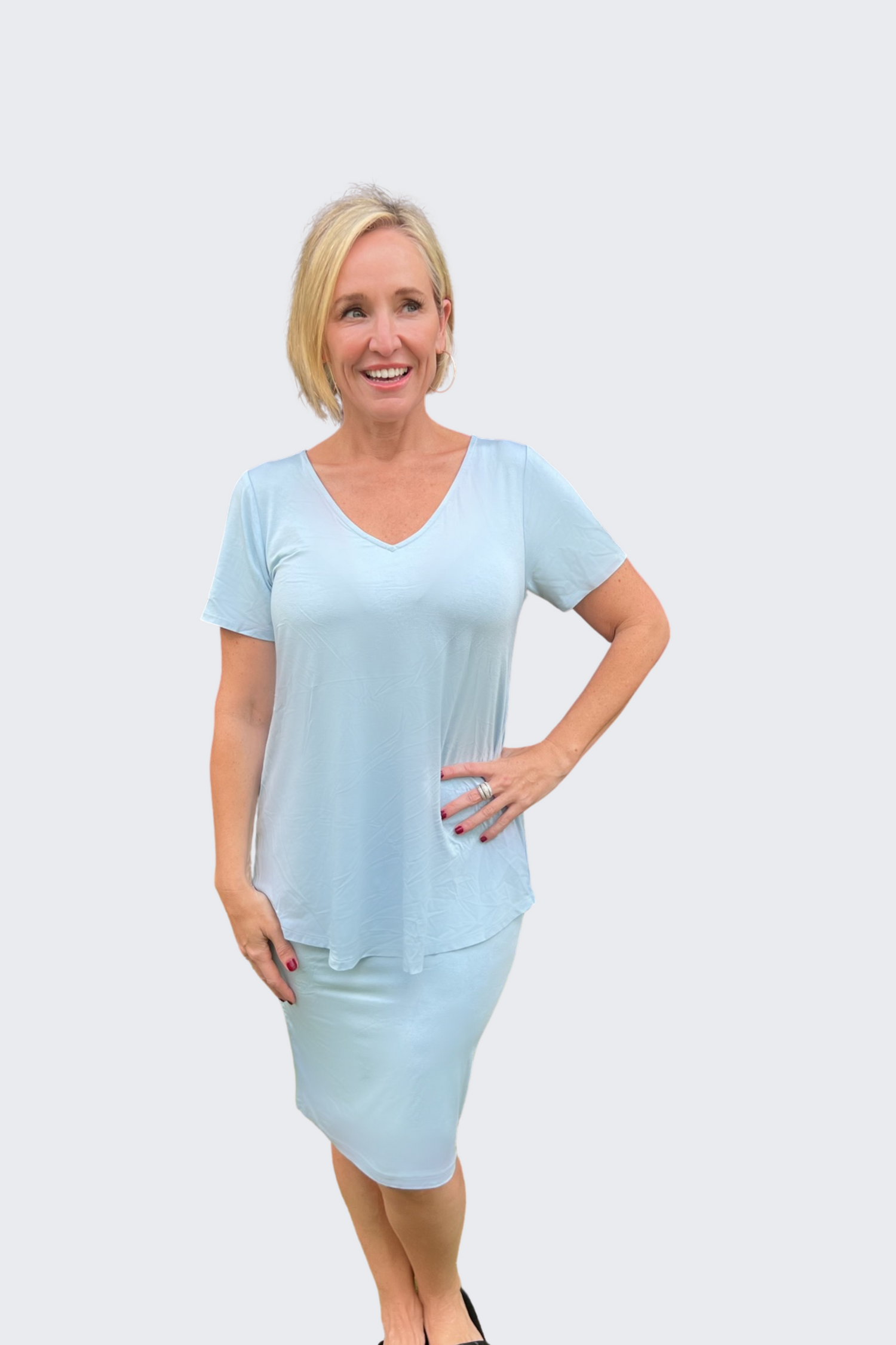 Made from our signature super soft bamboo blend fabric this relaxed tee doesn’t grab you, instead it gives your body the space it deserves. With a v-neck to compliment your shape and a scooped hem front and back, the Don’t Cling To Me tee is so flattering it will ruin all other t-shirts for you.